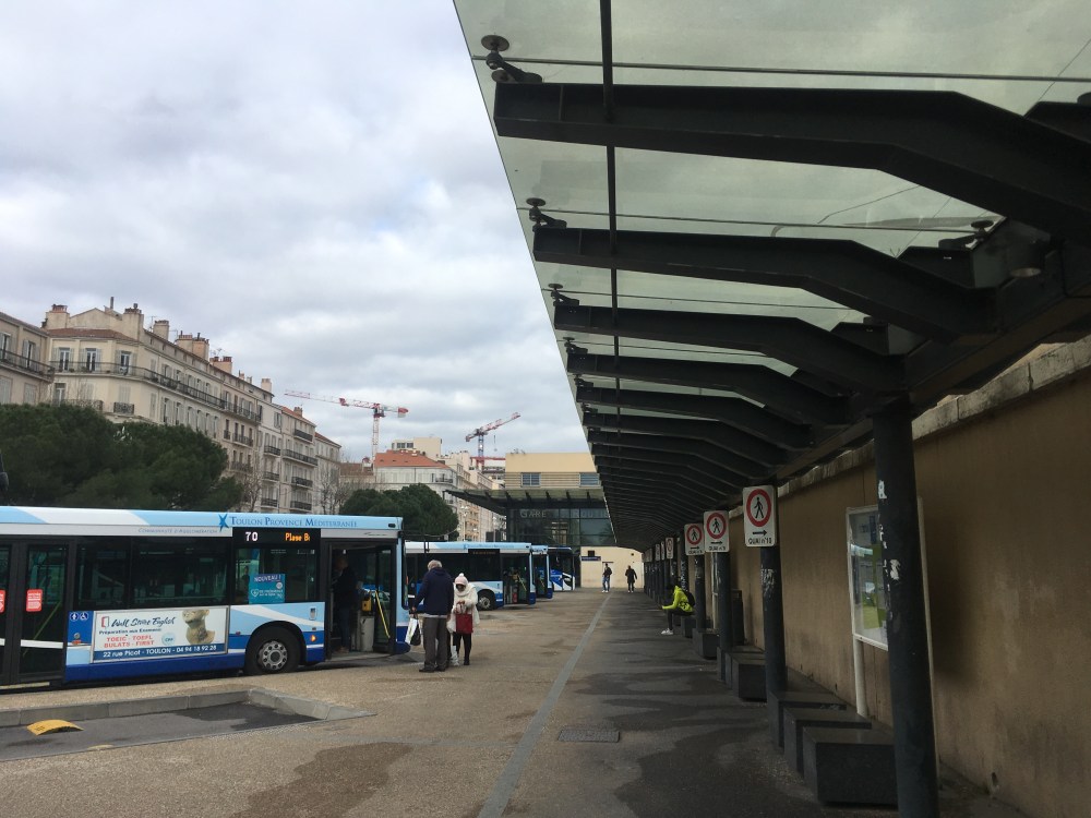 Irgendwann registriere ich, dass auch hier Busse fahren, die Toulon auf ihrer Anzeige haben. Der Bus fährt alle 30min und braucht fast eine Stunde für die Strecke, aber egal. So bleibt in T. noch Zeit für einen kurzen Abstecher in die Touristeninformation und mein morgiger Tag kann geplant werden. Kurz vor 6 bin ich im Hotel und versorge mich mit Tee und Wasser. Ich bin nicht richtig fit und gehe daher heute früh ins Bett. Gute Nacht!